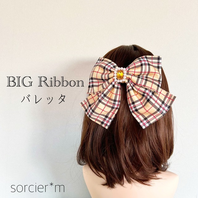 BIGリボン 宝石 バレッタ ♡ 大きいリボン ポニーテール タータンチェック ベージュ カジュアルロリータ カジュロリ ロリィタ