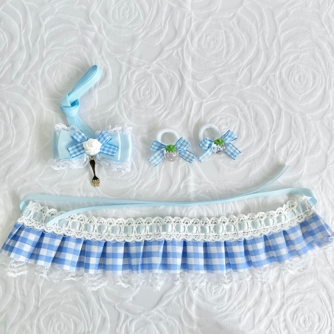 スカート部分と胸元のリボンは分かれているので気分によって取ったり、他の小物と合わせてご使用頂けます