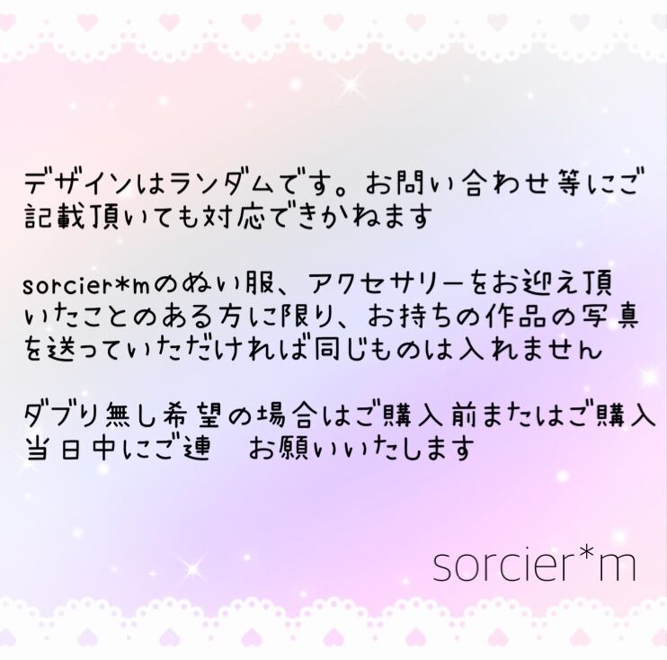 【ランダム】と記載のある物は柄は選べません。〇〇を入れてくださいと備考欄に記入があってもご対応できかねますのでご了承ください。sorcier*mのドレスをお迎えして下さった事のあるお客様はお持ちのドレスの写真をご購入後1日以内に送って頂けましたら同じ作品は入れません(⁎ᴗ͈ˬᴗ͈⁎)