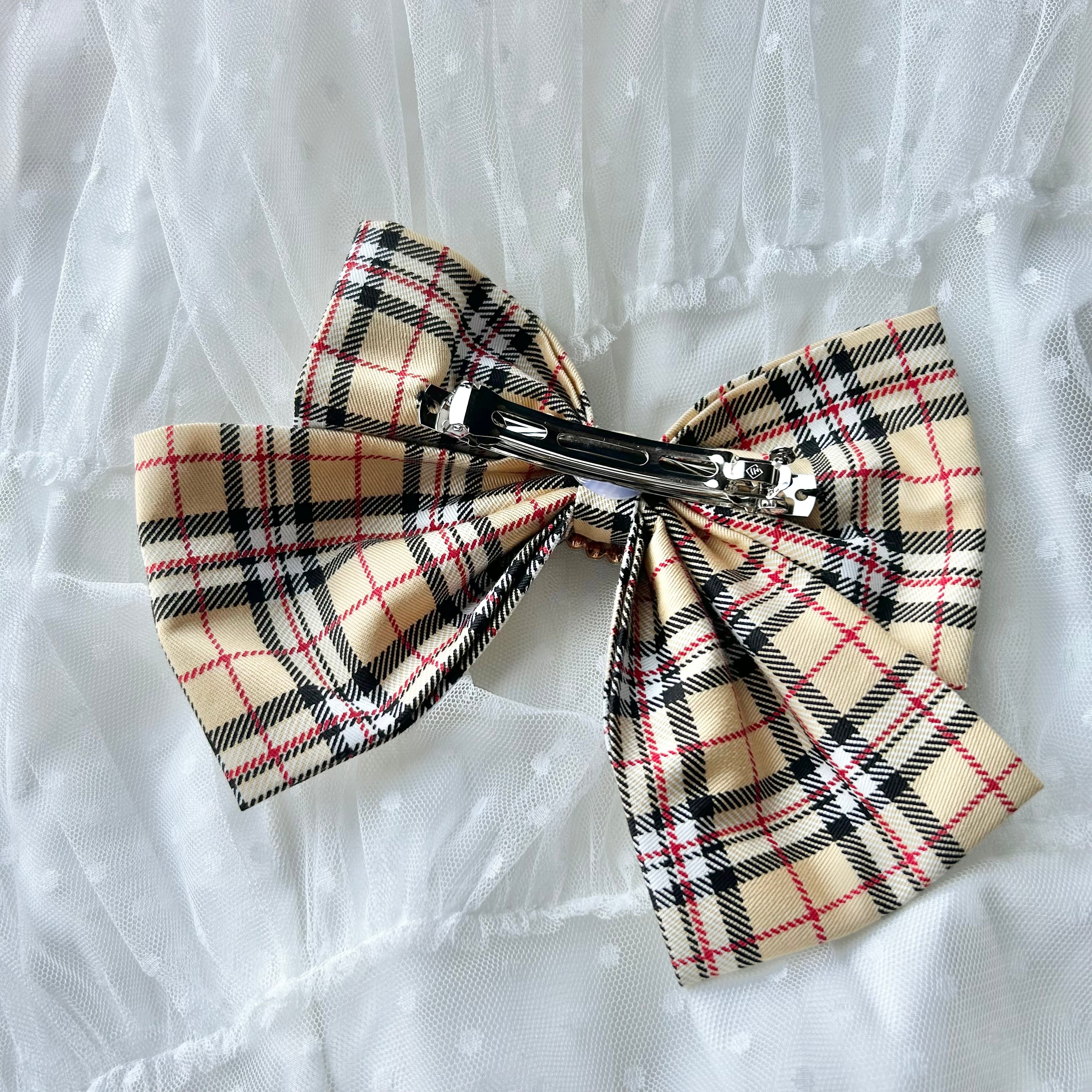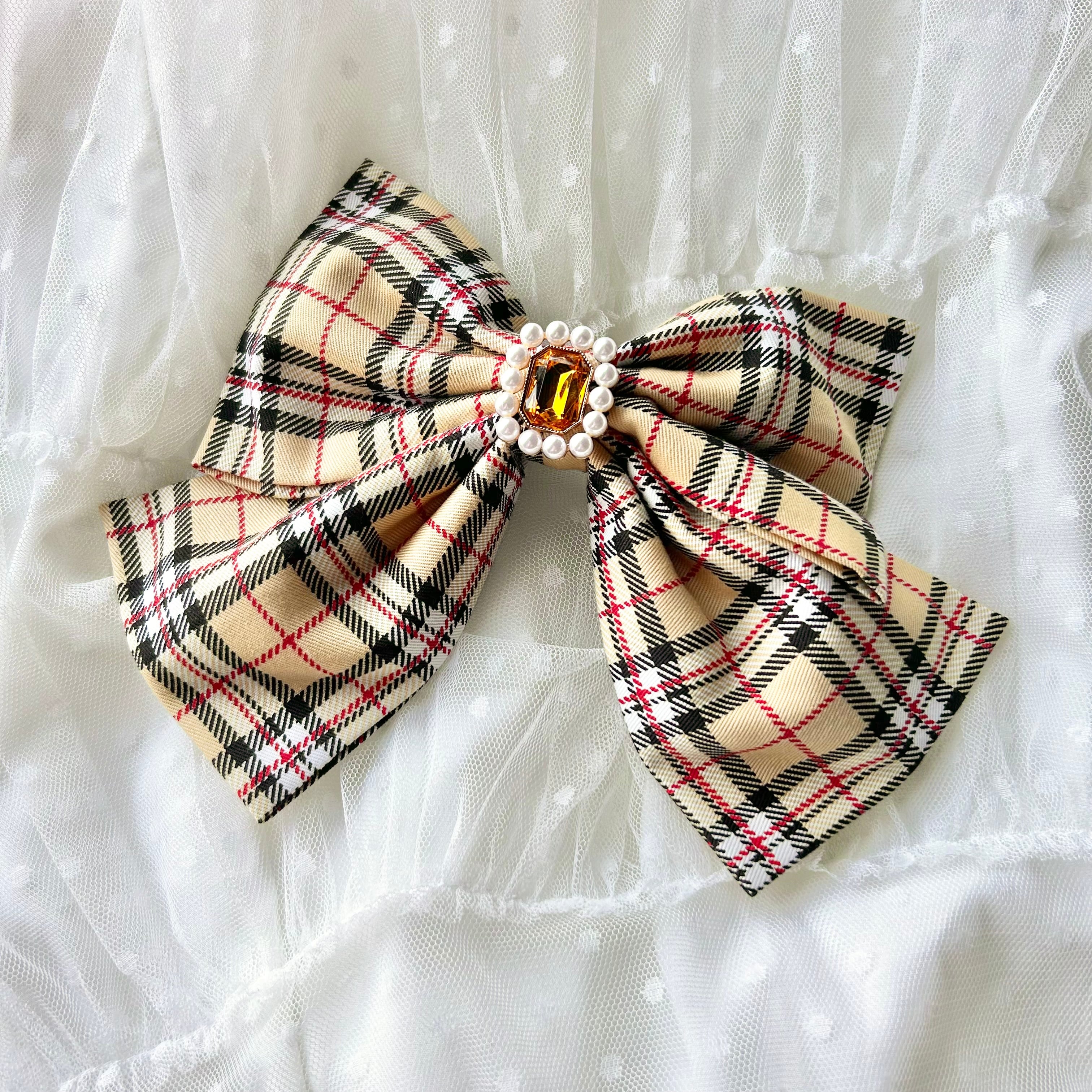 BIGリボン 宝石 バレッタ ♡ 大きいリボン ポニーテール タータンチェック ベージュ カジュアルロリータ カジュロリ ロリィタ