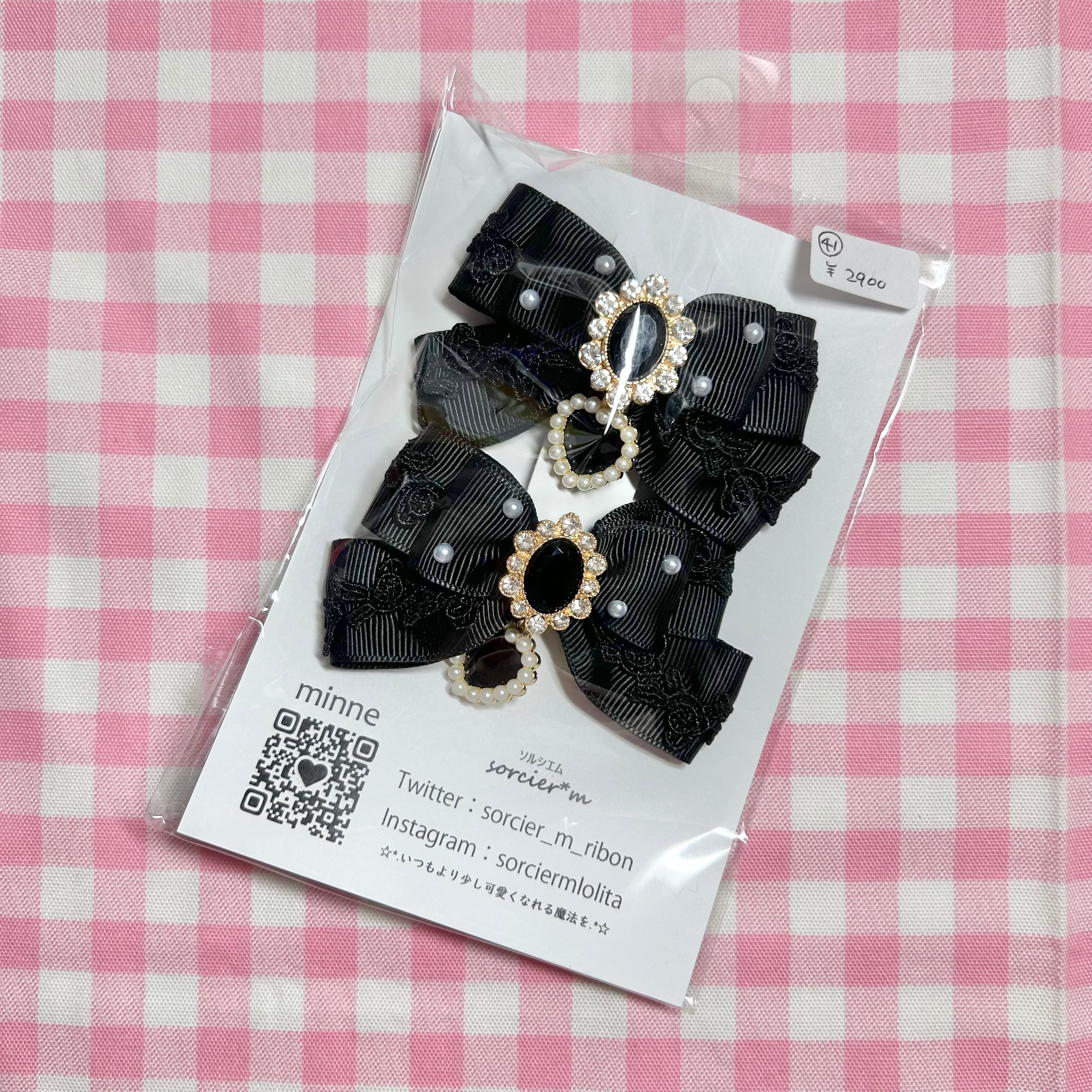 【ゴスロリマーケット アフター通販】リボン ヘアクリップ 薔薇レース ロリータ ロリィタ Lolita パール ツインテール 黒 ブラック ゴスロリ