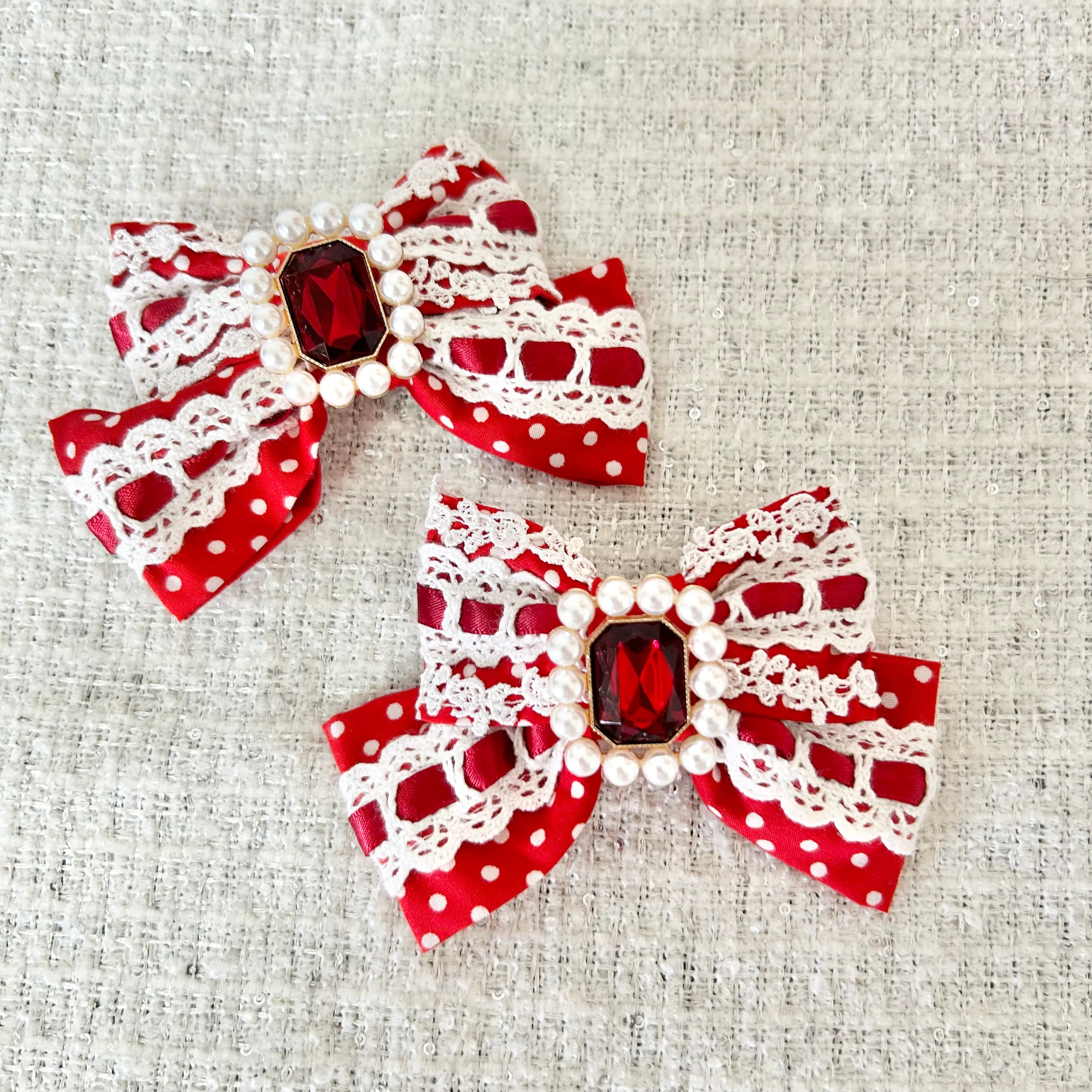 【ゴスロリマーケット アフター通販】リボン ヘアクリップ はしごレース ロリータ ロリィタ Lolita パール ツインテール 量産型 キラキラ ビジュー ハート ヘアメゴスロリマーケット アフター通販】はしごレース × ドット 宝石リボンバレッタ mini 赤 白 紅白 水玉 ドッロリィタ ロリータ リボン 懐古ロリータ 懐古ロリィタ 甘ロリ Lolita ribbon ドット 赤 薔薇レース