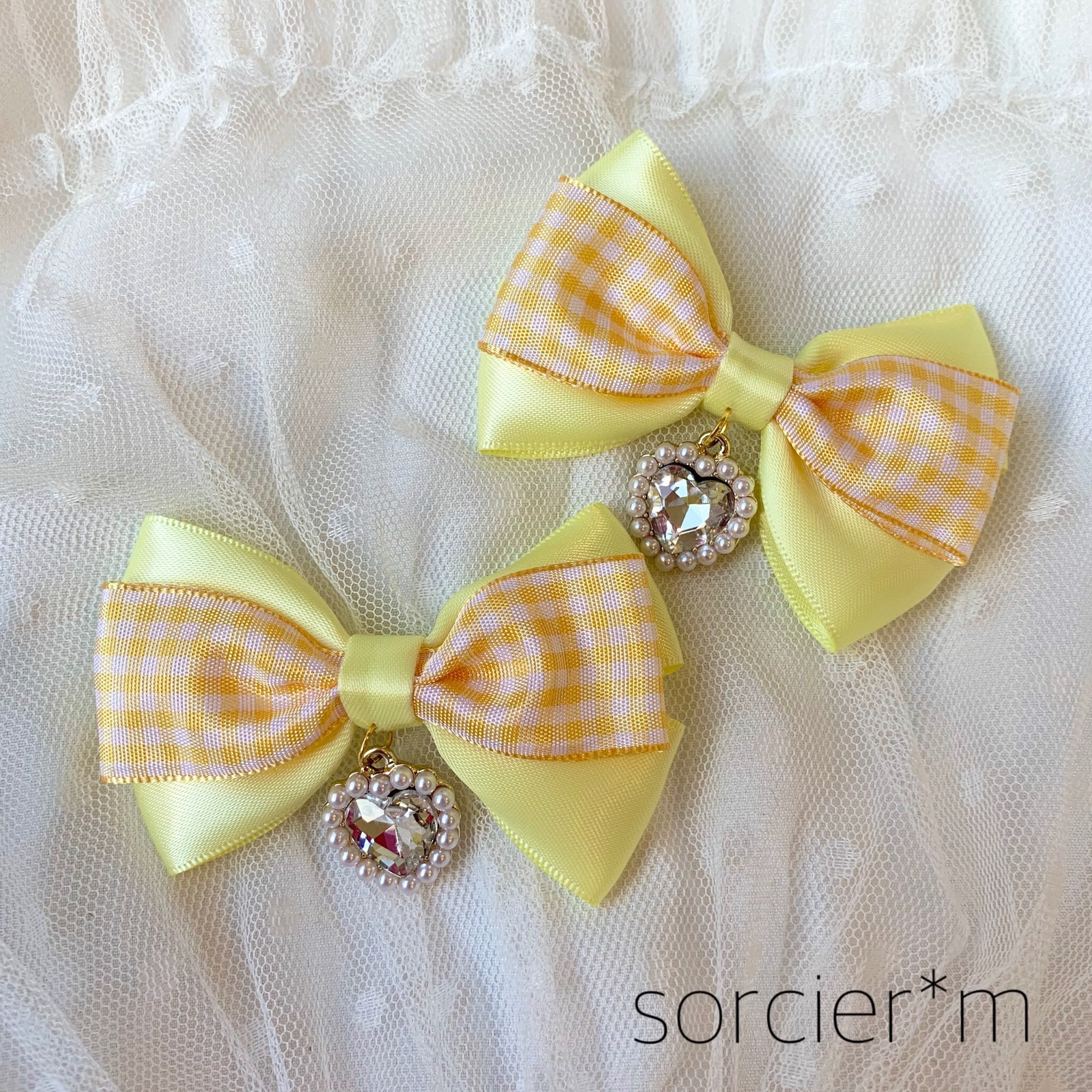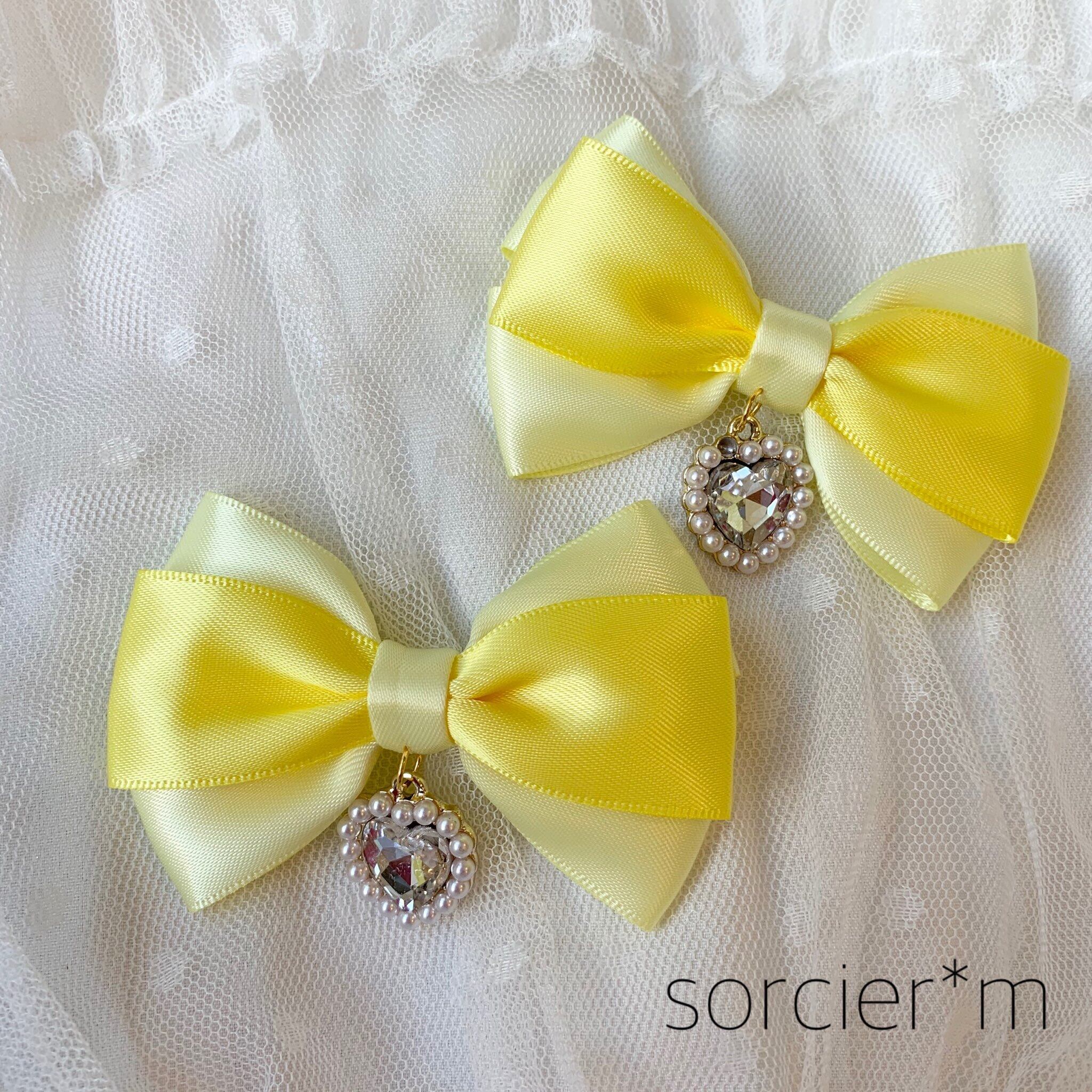 Jewel ♡ リボン ヘアクリップ ヘアピン 量産型 イエロー ロリィタ ロリータ ゆめかわいい ハート パール キラキラ シンプル ツインテール 推しカラー きいろ 黄色 レモン
