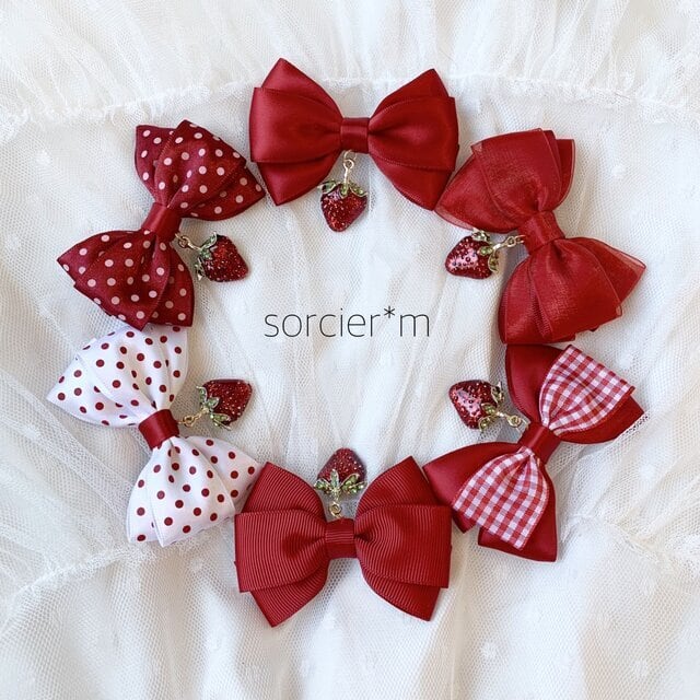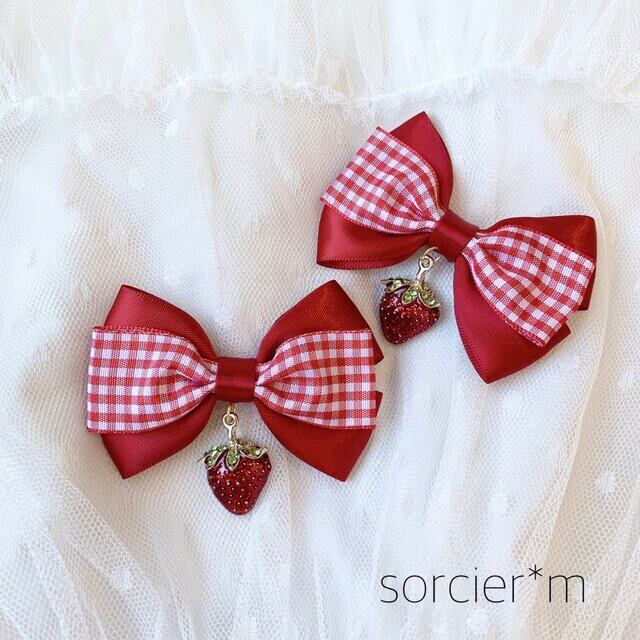 strawberry ♡ リボン ヘアクリップ ヘアピン 苺 いちご イチゴ 量産型 ロリィタ ロリータ ゆめかわいい 病みかわいい シンプル 赤 ギンガムチェック ドット 水玉
