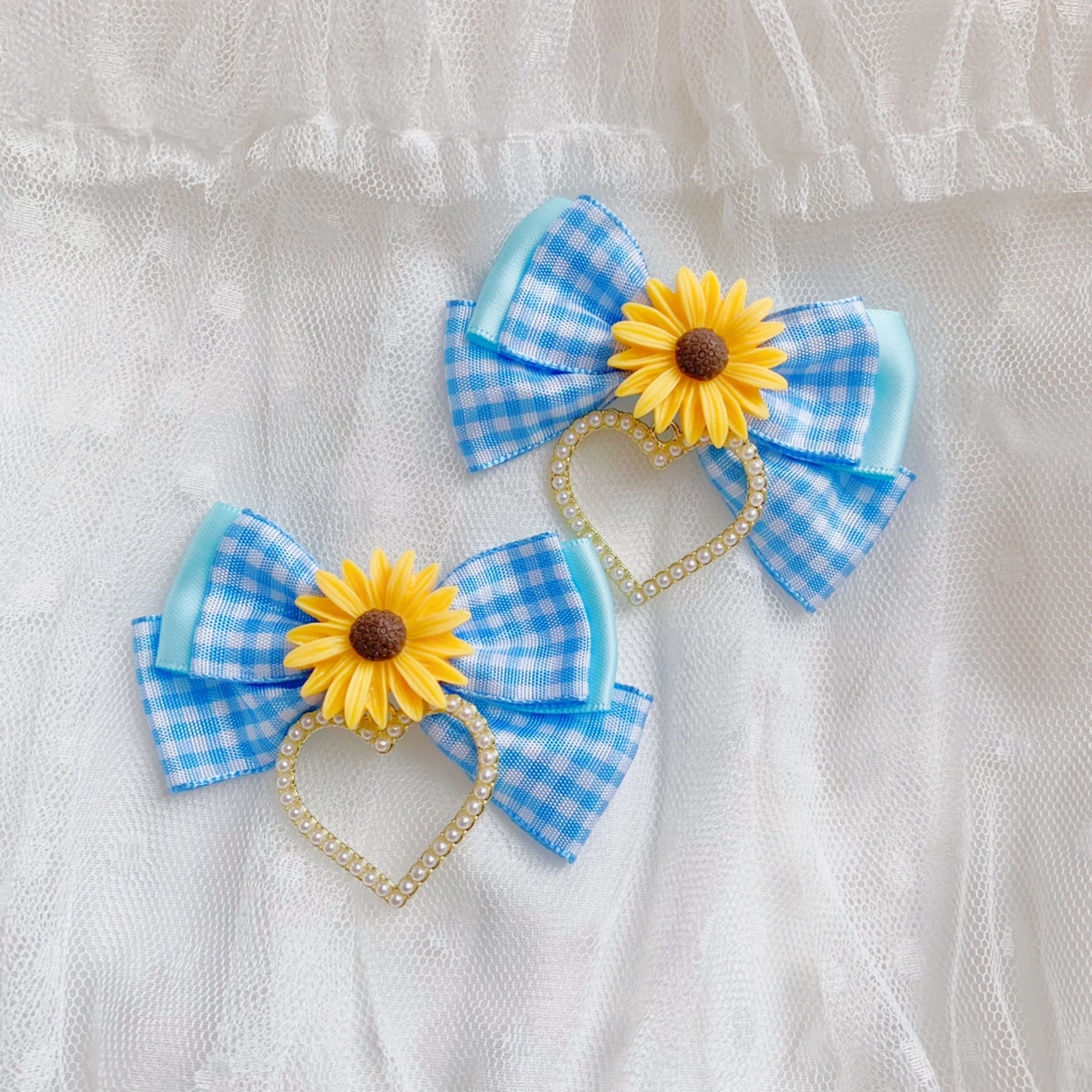 ミニ 向日葵 ひまわり リボン ヘアクリップ ギンガムチェック レース 黄色 水色